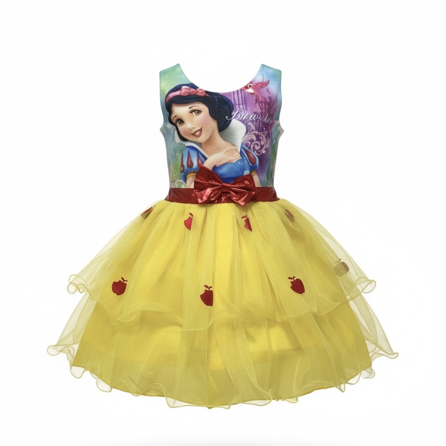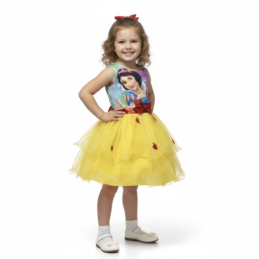 Haz que tu pequeña se sienta como una auténtica princesa con este encantador vestido amarillo inspirado en Blanca Nieves. Este diseño único combina detalles mágicos que fascinarán a cualquier niña: desde un top decorado con la imagen de la princesa, hasta una falda de varias capas con un tutú amarillo adornado con delicadas manzanas rojas de tul. Este vestido es perfecto para capturar la imaginación y transformar cada momento en un cuento de hadas.